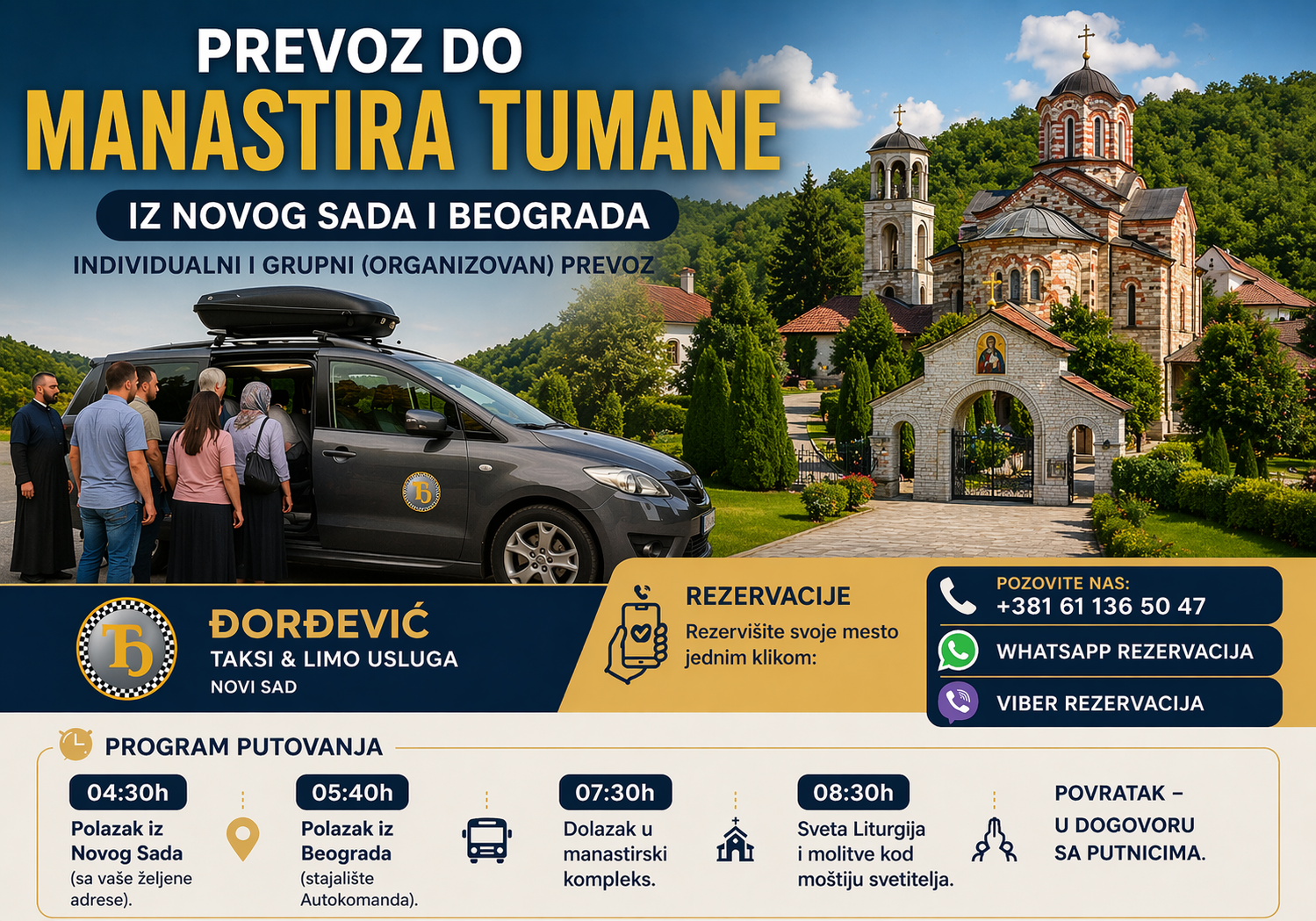 Prevoz do Manastir Tumane iz Novog Sada i Beograda – organizovan i individualni prevoz putnika na liturgiju i poklonjenje moštima. Đorđević Taxi & Limo Novi Sad nudi siguran, udoban i pouzdan prevoz uz polazak sa adrese i brzu rezervaciju telefonom ili WhatsApp-om.